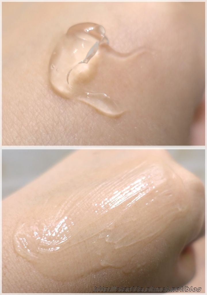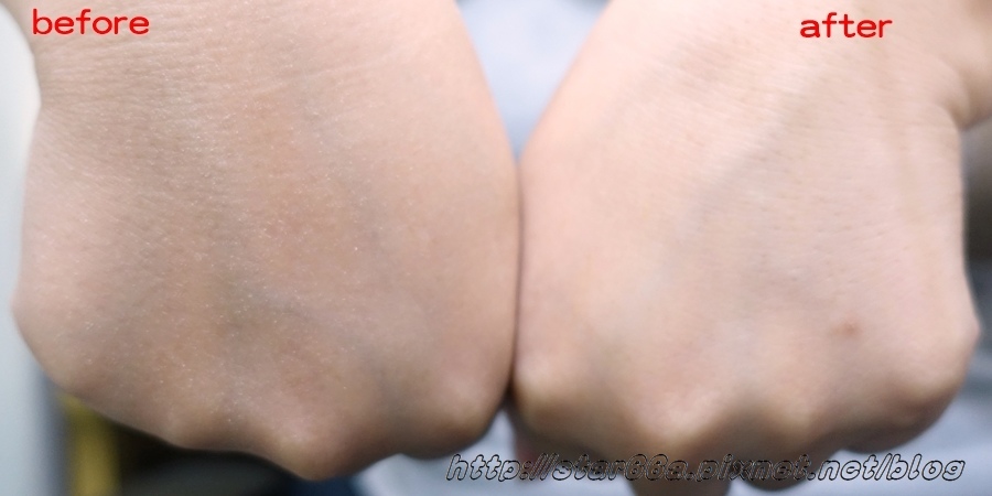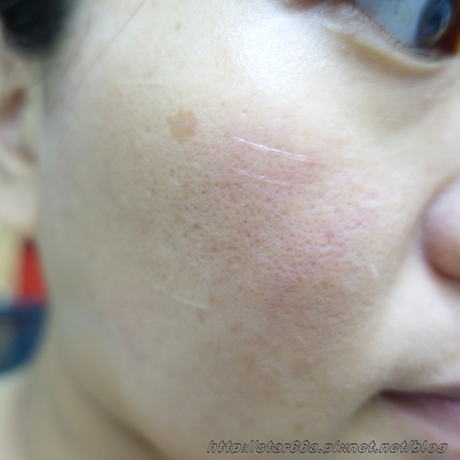 均勻的推開在手背上,沒有悶住的感覺,因為是試在手背,所以是薄擦,吸收的速度中等,要稍微按摩一下才能完全的吸收。