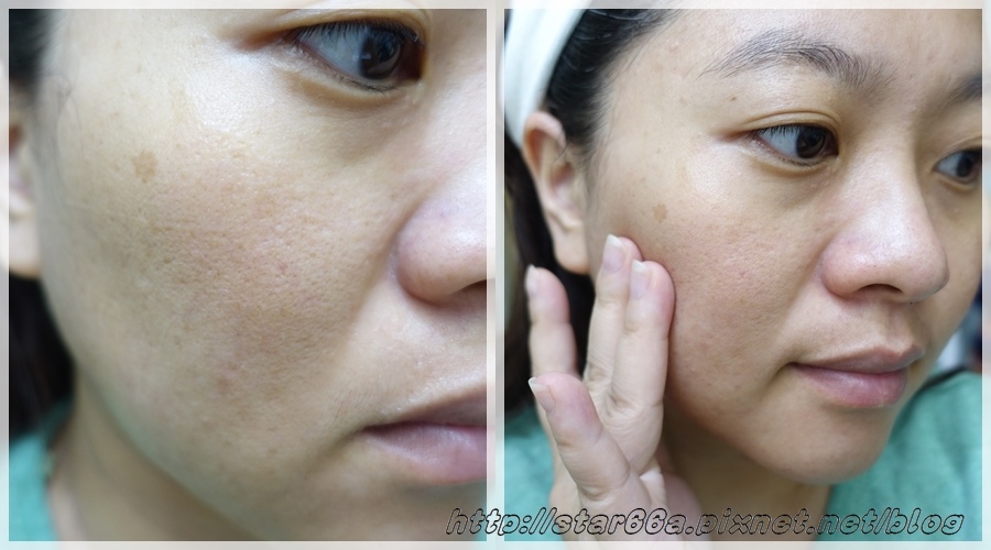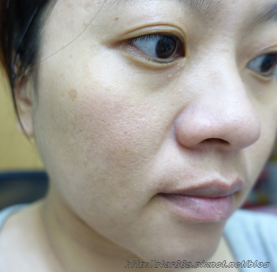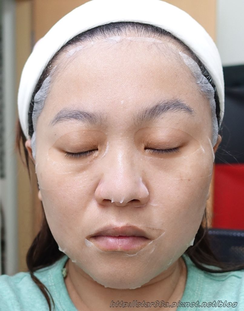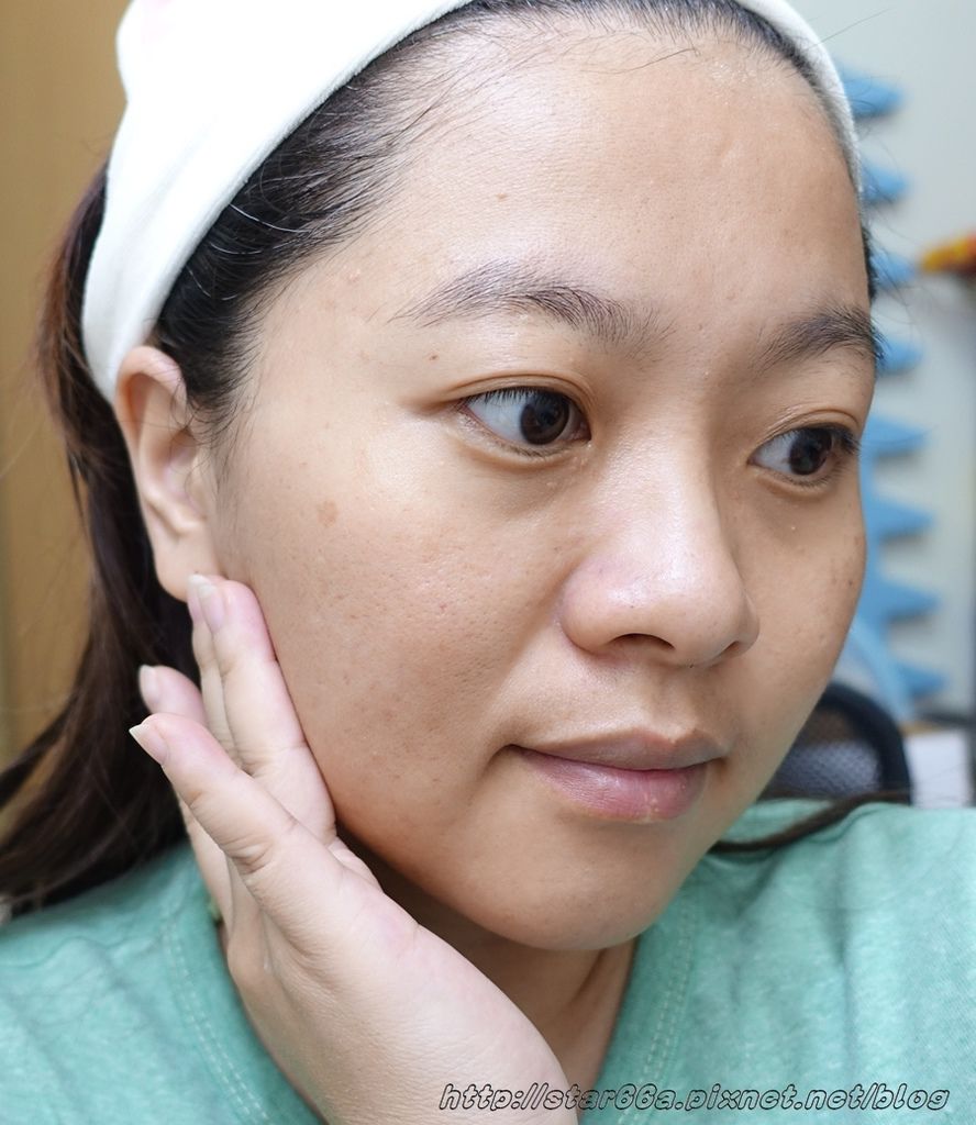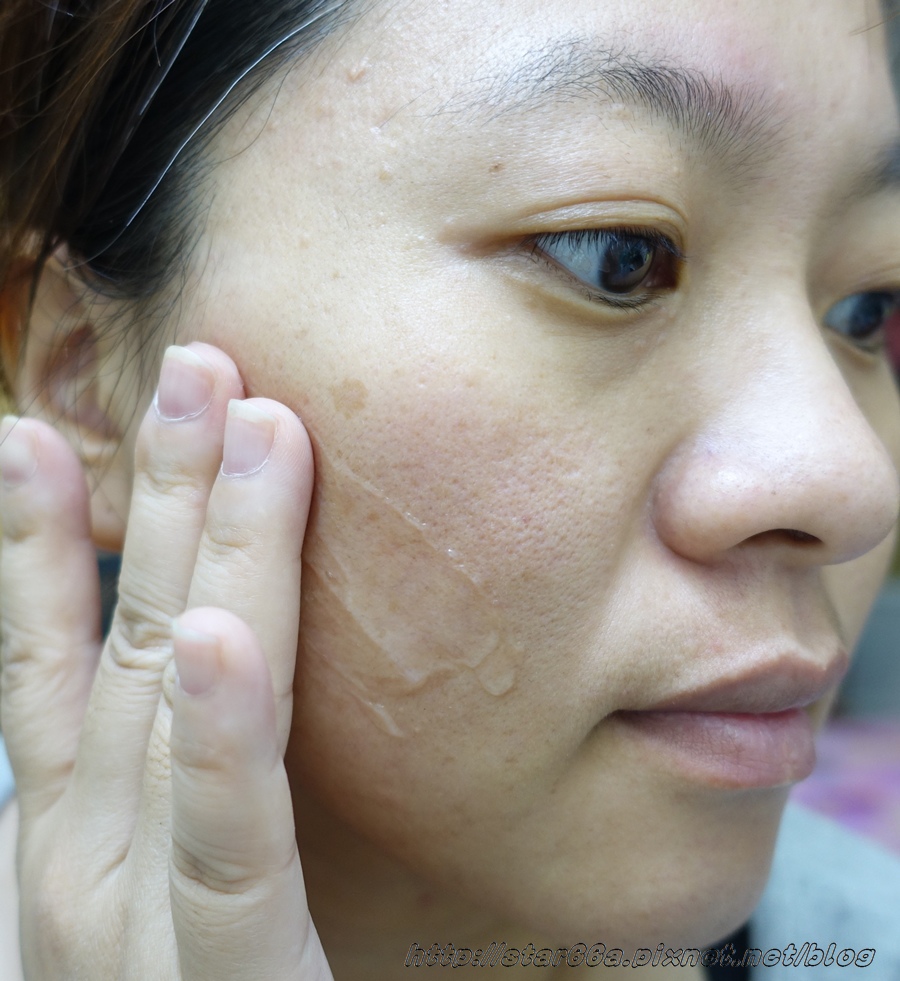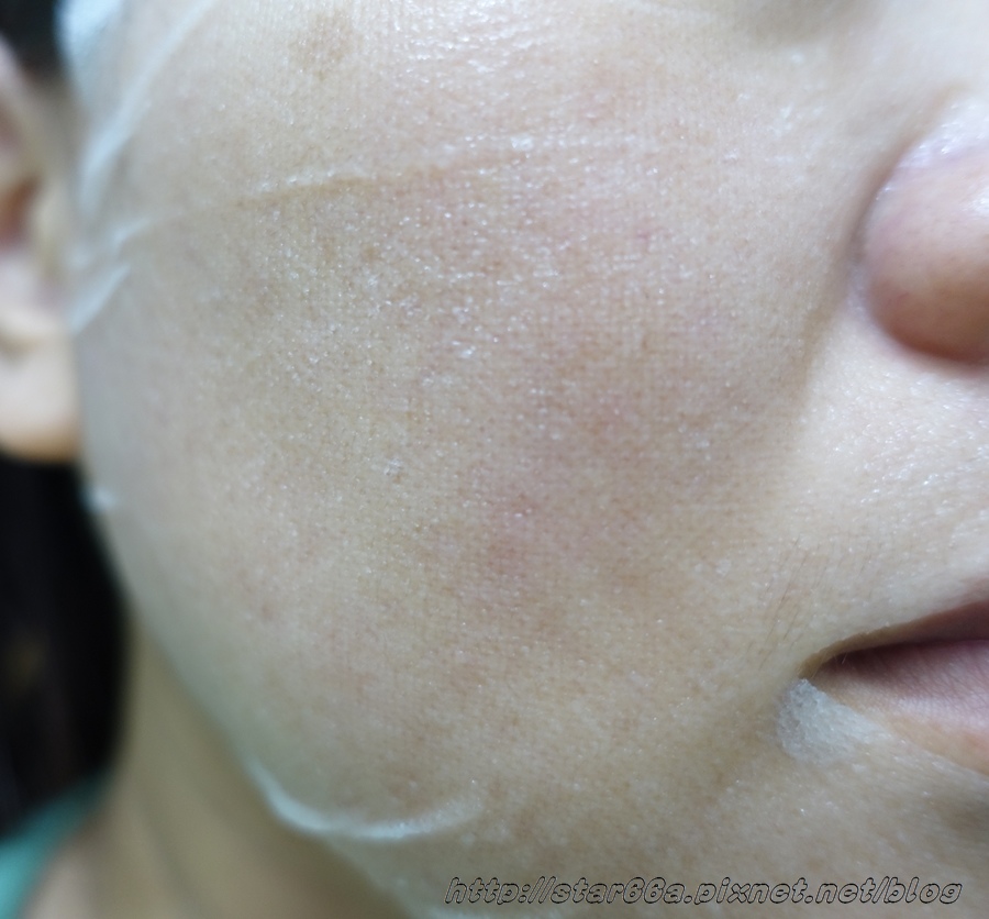 大約15~20分鐘後,面膜就可以取下來了,殘留在肌膚上面的精華液可以利用指腹稍加按摩讓它吸收,因為精華液是屬於有點稠狀的精華液,所以最後用指腹按摩的時候有一點黏黏的,老實說,我一度有想去洗掉的念頭,但是等精華液完全吸收之後,肌膚就完全不黏了。
